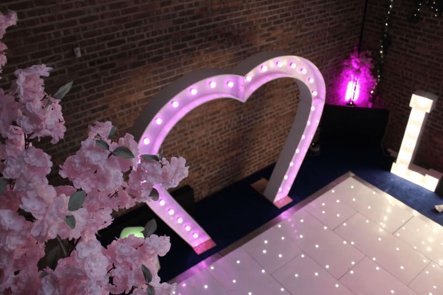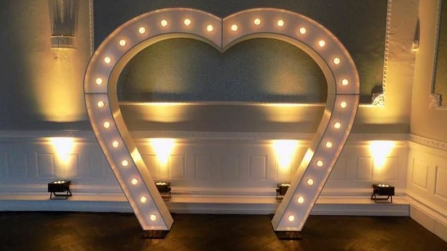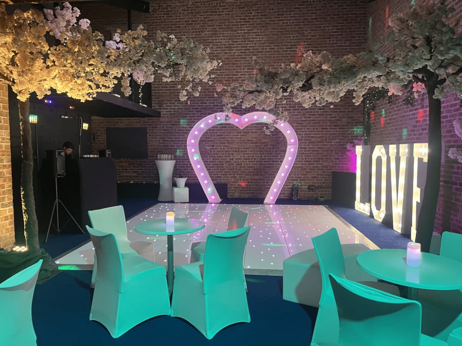 To book this light up heart arch, just use the big buttons below - you can even check its availability against our live diary. Our innovative online booking system collects all the information we require, and we will confirm your details with a phone call. Or if you have any questions about this or any other hire of decor which would go well with this heart arch check out our ultimate wedding package which include blossom trees for tables, lights, LED dance floor or letters and much more call us now on 01512 034455!