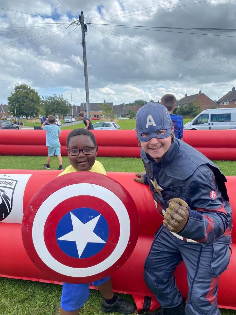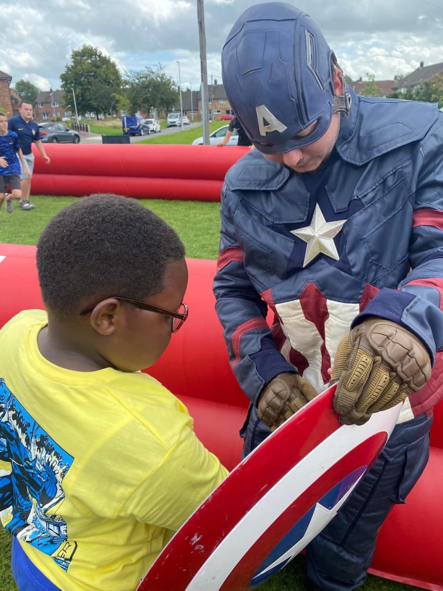 To book our Captain America , just use the big buttons below - you can even check his availability against our live diary. Our innovative online booking system collects all the information we require, and we will confirm your details with a phone call. Or if you have any questions about this or any other offers such as our avengers package, captain america can come alone but if you'd like to check out the full avengers party package to get the full experience, this includes : Realistic Hulk, Light up LED Iron Man, Spider- Man, 10 ft x 60 ft obstacle course, certificates and light up LED number of choice. Make your party an unforgettable one, call us now on 01512 034455!