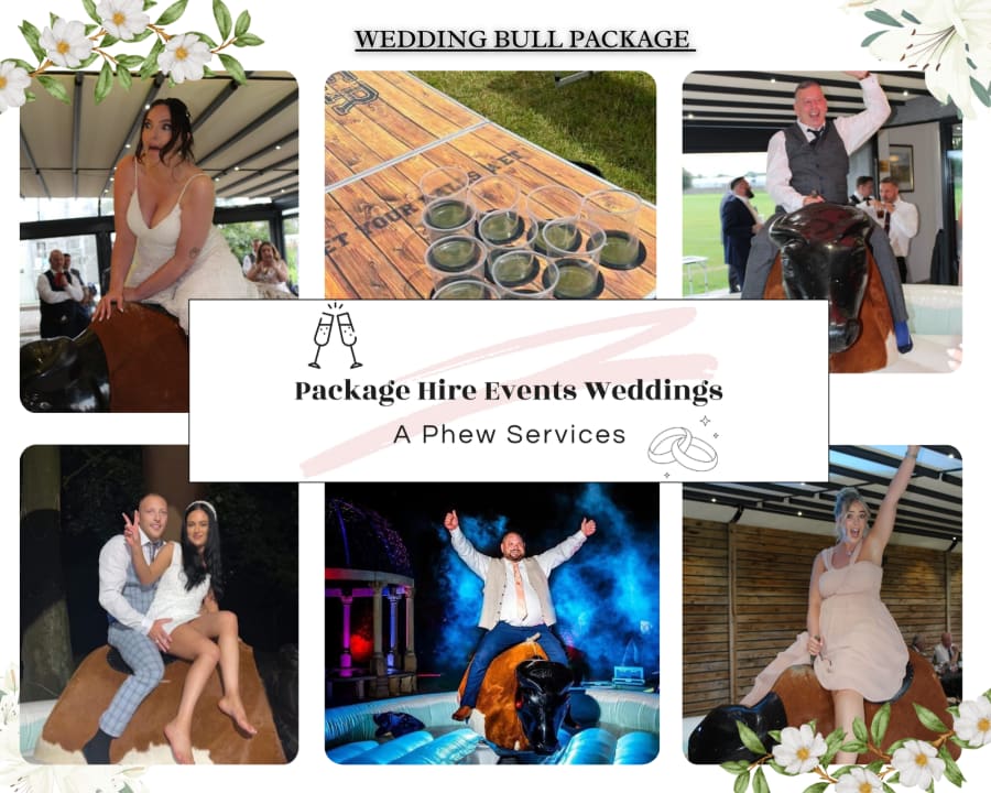 Bluetooth LED speakers, 2 beer pong tables with cups and balls, and last but not least our mechanical rodeo bull with a veil and our white inflatable. The inflatable comes with our giant inflatable canopy (optional) just in case of any unsuspected rain outdoors! What makes this package complete is the bull is operated by our trained mascot vicar to host with a microphone for calling the vows to your ridders! We can provide a playlist of your choice and our electronic score display will decide who lifts the trophy! Just to make this package even better we provide photography throughout the day/night so you can enjoy the party without missing any of the fun! We send the pictures to you after the party so you are free to post them up...just remember to give us a shout out PHEW!