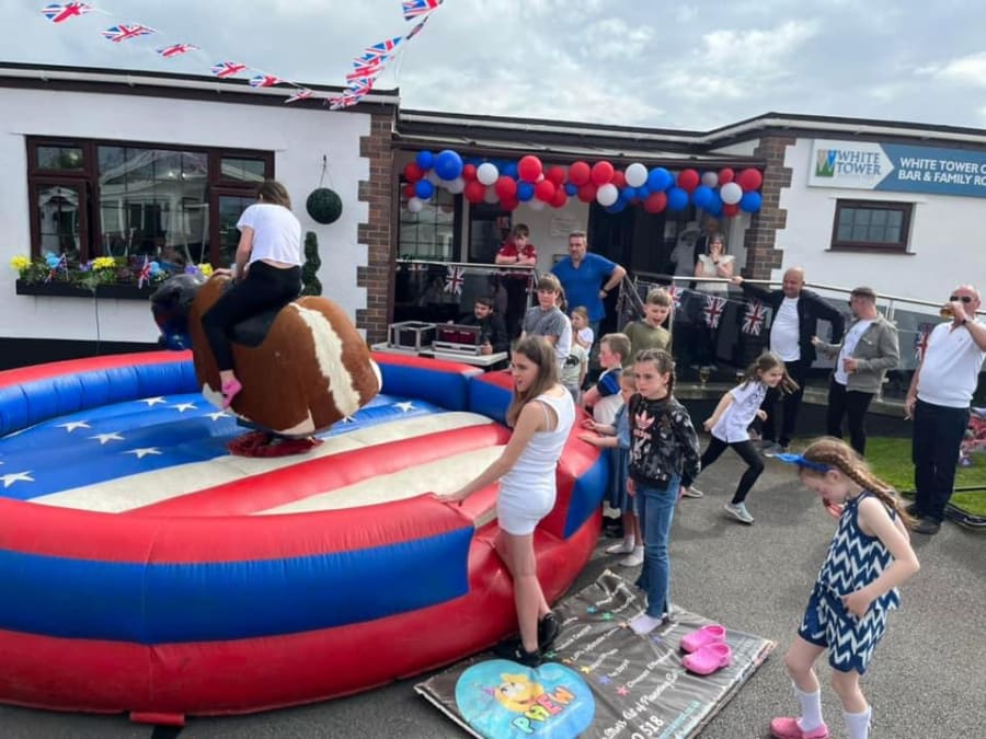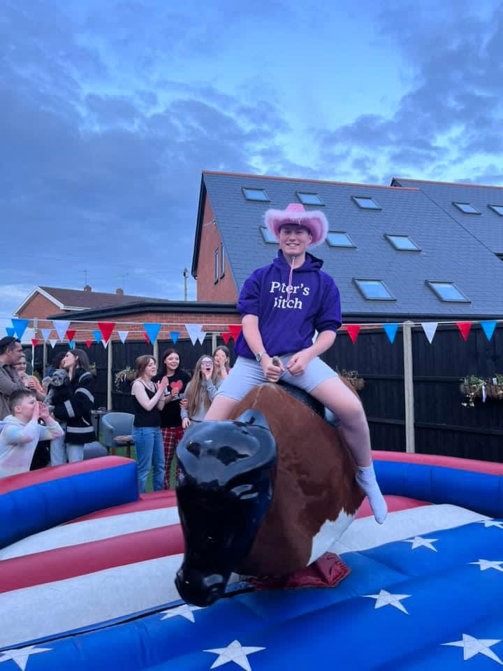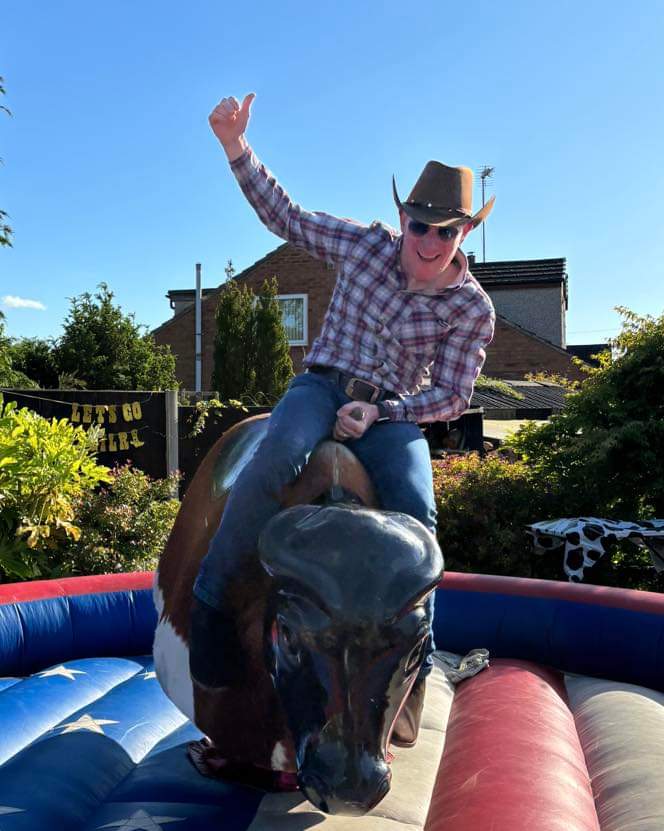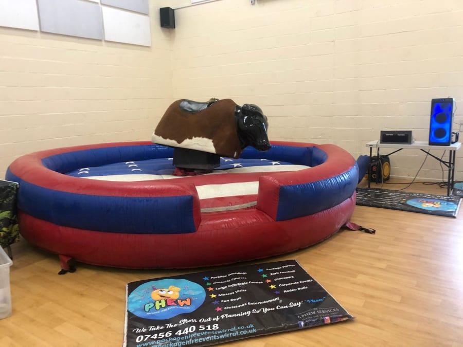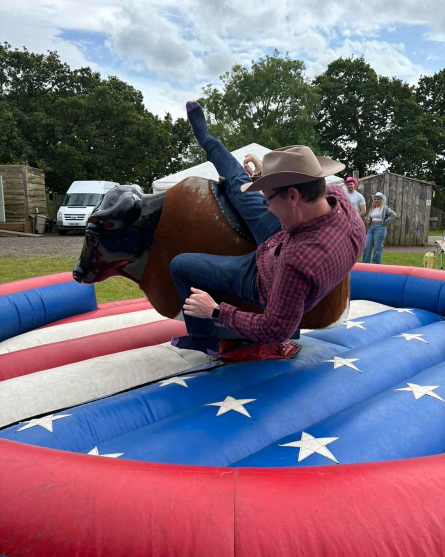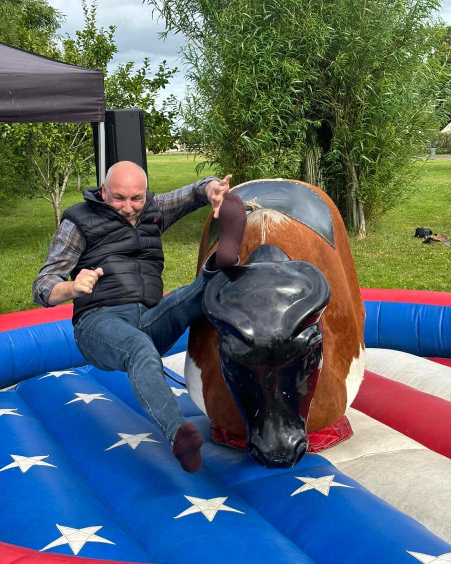 The aim of the Rodeo Bull is to stay on for as long as you can while it is spinning and bucking and steadily getting faster under the control of one of our operators to ensure the equipment is being used safely and correctly.